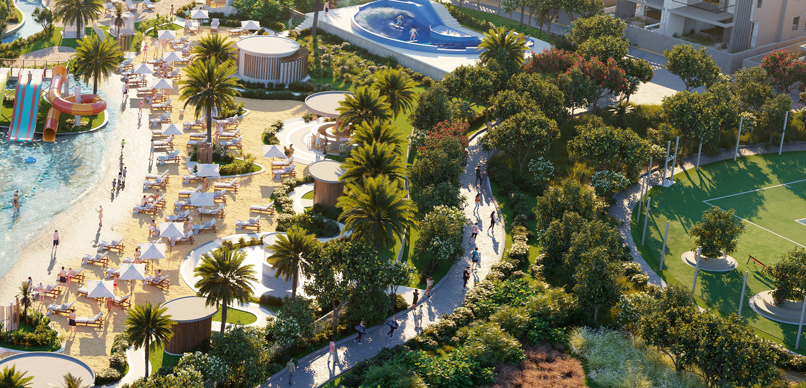 - Large-scale amenities: Malibu Beach, lazy river, wave simulator, outdoor cinema, petting farm, fishing lake, skate park, butterfly garden, bird aviary—the first in UAE :contentReference[oaicite:4]{index=4}